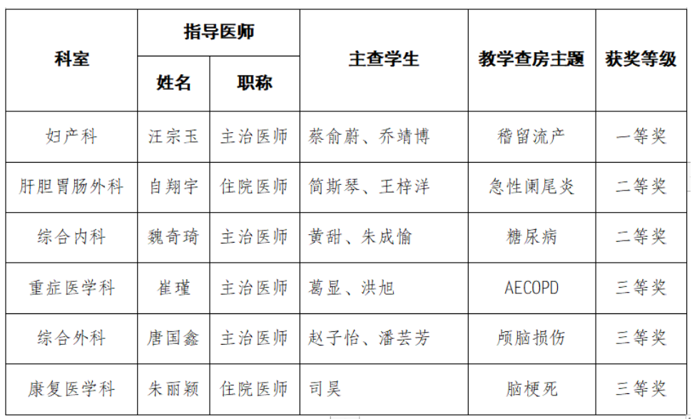 经过一天激烈角逐,竞赛最终评出一等奖1名、二等奖2名、三等奖3名。妇产科汪宗玉医师团队凭借规范流程、生动讲解与深厚人文关怀,以“稽留流产”教学主题拔得头筹,荣获一等奖;肝胆胃肠外科自翔宇团队、综合内科魏奇琦团队获二等奖;重症医学科崔瑾团队、综合外科唐国鑫团队、康复医学科朱丽颖团队获三等奖。