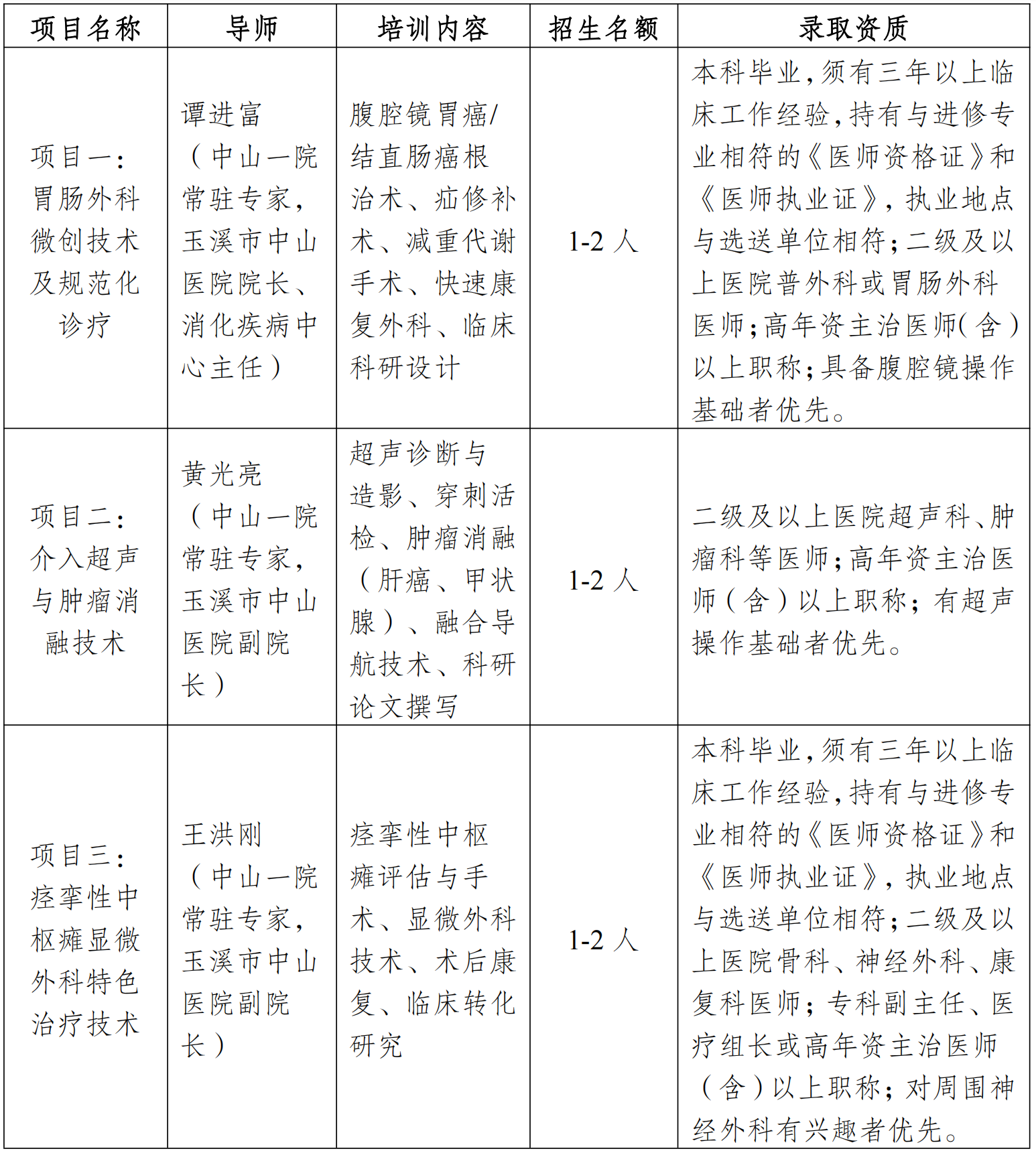 为深入贯彻落实《云南省促进卫生健康人才队伍发展三十条措施》及《玉溪市促进卫生健康人才队伍发展的实施意见》精神,助力“健康玉溪”建设,强化我市医疗卫生人才队伍建设,加速培育一批扎根基层、技术过硬、理念先进的临床学科带头人与技术骨干,充分发挥玉溪市中山医院省级区域医疗中心的辐射带动作用,同时发挥常驻专家的技术引领和 “传帮带” 作用。经玉溪市医学会与玉溪市中山医院研究决定,将面向玉溪市及周边地区各级医疗机构启动 “菁英锻造”学科带头人培育项目。本方案以 3 个月为周期,由三位常驻专家全程带教,通过“理论授课+临床实操+管理参与”三位一体培养模式,帮助学员实现临床能力与学科管理能力的双重跃升。现将菁英锻造学科带头人培育项目多批次进修招生,具体事项通知如下: