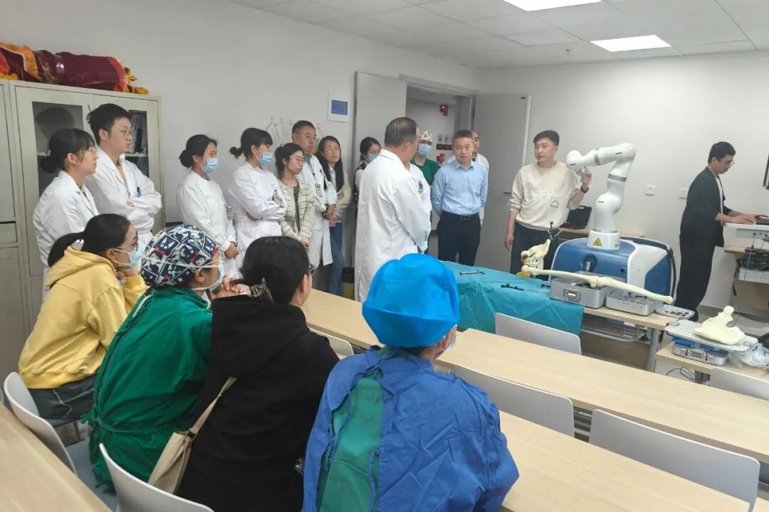 培训会由副院长刘江辉主持。课程围绕骨科手术机器人的核心技术,采用“虚实结合”教学模式,通过高仿真手术模拟平台与实体操作台的双向联动开展培训,涵盖术前规划模拟、术中精准定位、人机协同操作等模块,实现理论认知向临床能力的精准转化。
