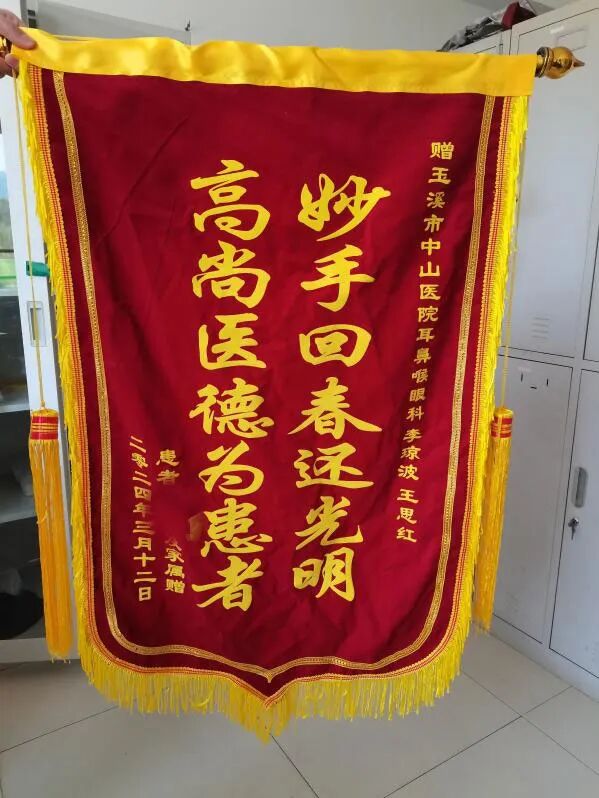 2025年3月12日,占女士及家属将一面印有“妙手回春还光明 高尚医德为患者”字样的锦旗送到玉溪市中山医院耳鼻咽喉(眼)科李琼波医生和王思红护士手中,感谢医护人员让她重获光明。