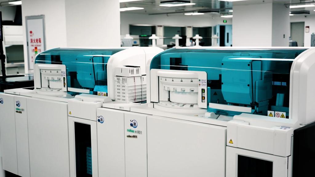医学检验科配备先进的全自动生化免疫流水线、全自动血细胞分析流水线、全自动凝血流水线、全自动酶免工作站、微生物质谱检测系统及微生物培养系统等,可开展200多项检测。同时,实验室空间布局合理、检测仪器设备先进、操作规范严格,能进一步提升检验报告的精准性。