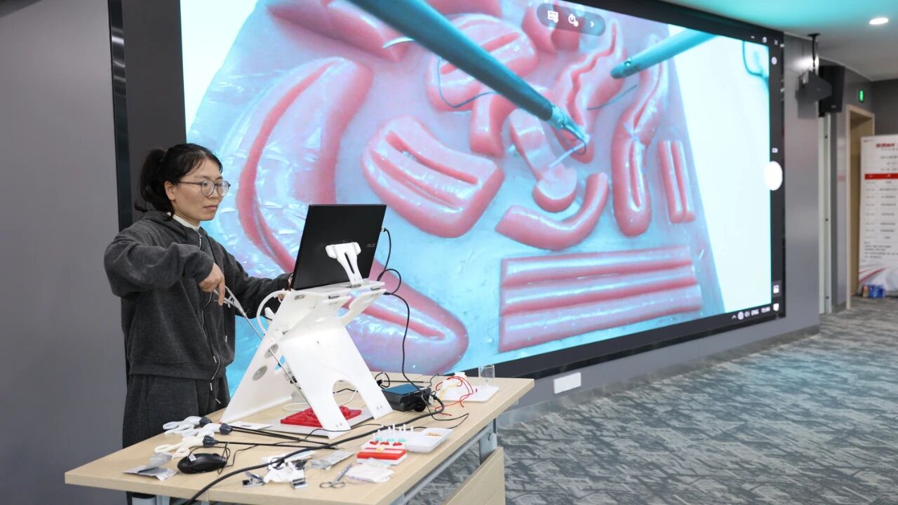 实操过程中,学员积极参与、认真实践,纷纷分享学习感悟。“以前在临床中总觉得腔镜缝合难上手,自己摸索时经常因为器械选不对、力度控制不好浪费时间。今天谭院长手把手教我们夹针、打结的技巧,还指出了我操作中的误区,比如‘线交叉时手不交叉’的原则,一下子就豁然开朗了。而且能在真实组织标本上练习,手感和临床实际操作特别接近,这种实操机会太难得了!”