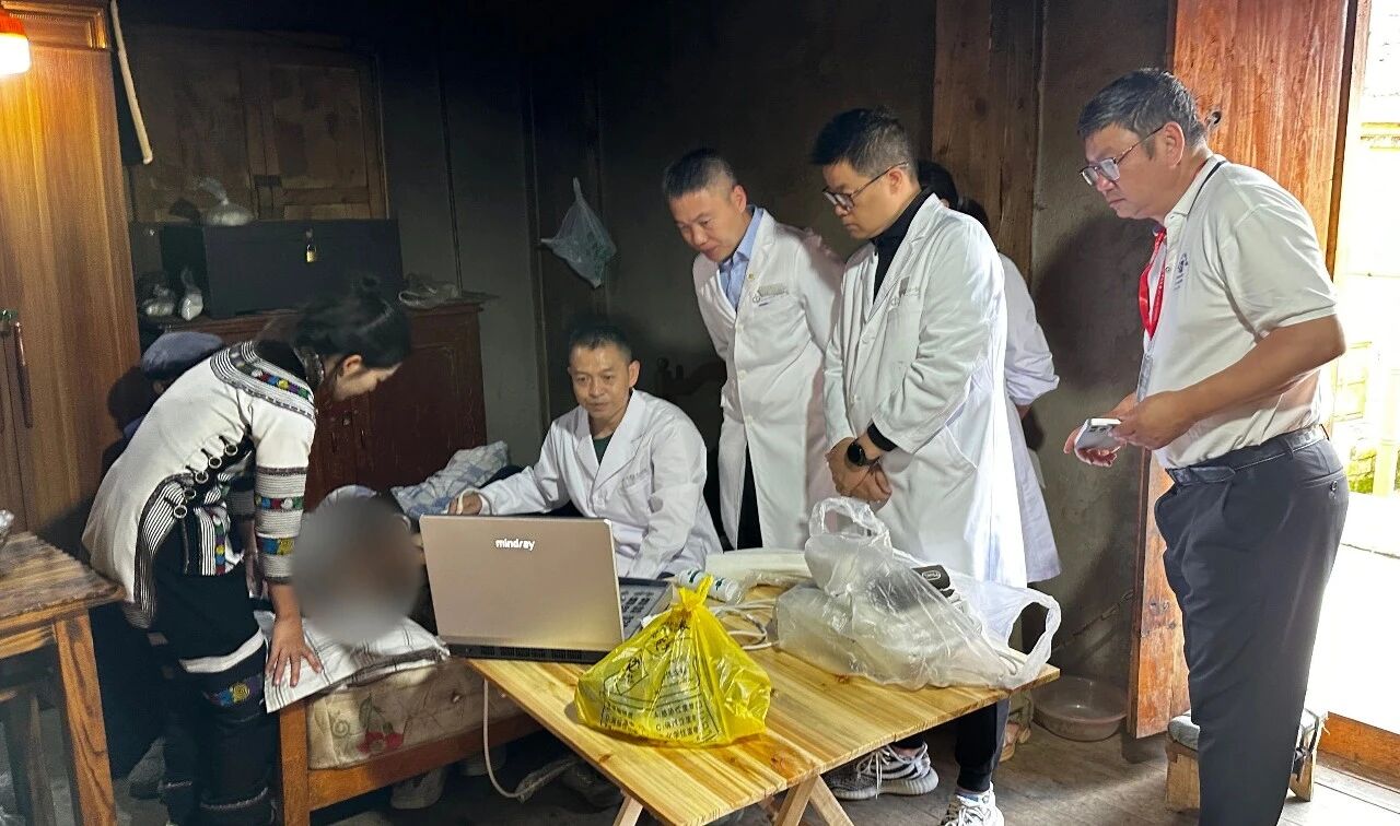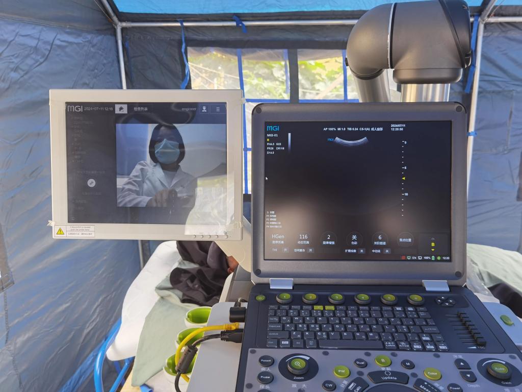 为做好义诊工作,专家队特意携带了移动心电图检查设备、远程移动超声检查设备以及丰富的药品等医疗物资。在中山大学旅游学院学生协助下,医疗队迅速搭建起义诊帐篷,设立多个诊疗台,运用远程超声连线身在广州中山大学附属第一医院超声科主治医师龙海怡通过远程操作,为村民开展专业优质的超声检查。