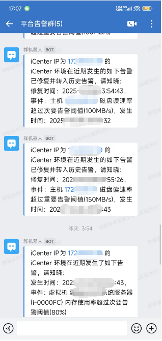 这项功能成功打通三个关键平台,构建出一条高效的告警信息链:监控端(虚拟化/超融合平台)——处理端(网络信息部运维平台)——通知端(企业微信)。即使在非工作时间,工程师也能像收到微信消息一样,第一时间掌握系统动态,迅速启动处置流程,最大程度降低对各位同事工作的影响。