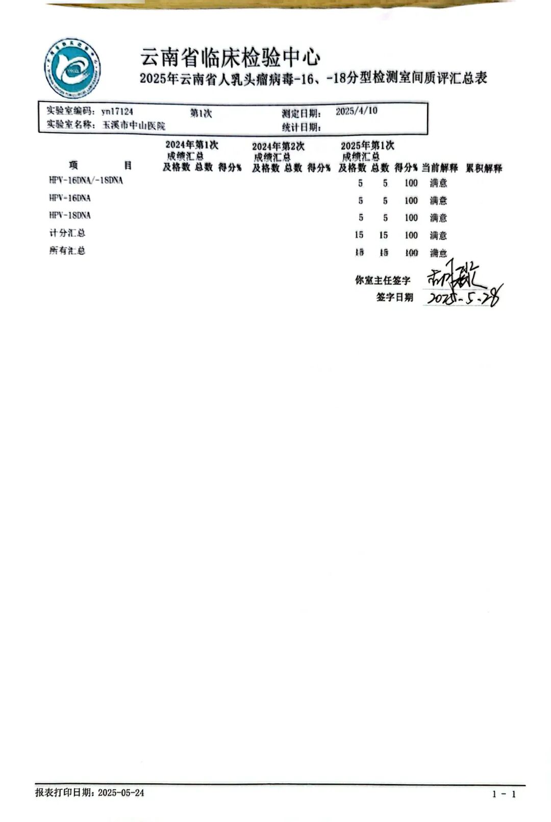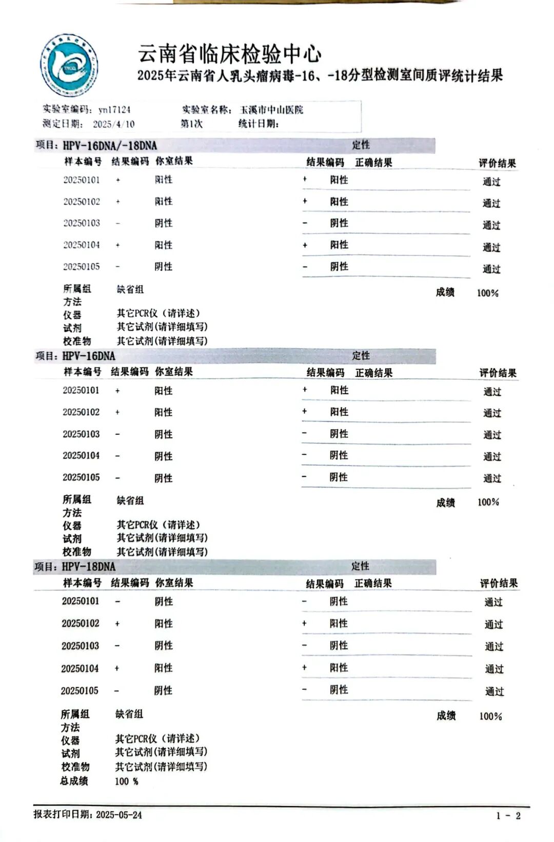 喜讯一:以满分成绩顺利通过云南省临床检验中心2025年度HPV16/18(宫颈癌重点筛查靶标)分型检测室间质评考核,成为玉溪市首批达到省级精准标准的医疗机构。