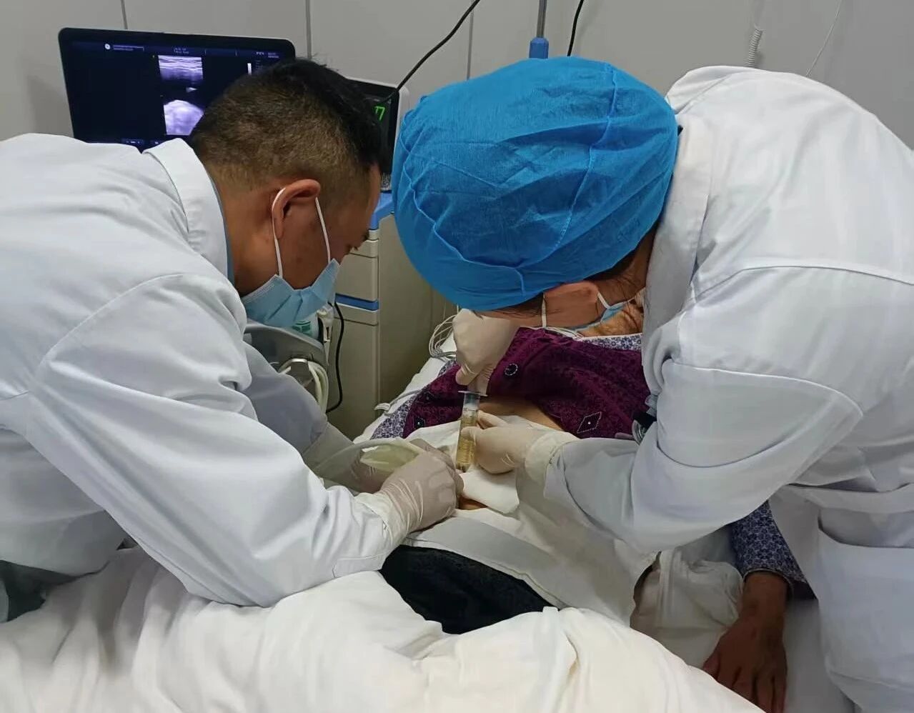 高龄患者常伴随心肺功能减退,且多患基础性疾病,行传统手术面临着麻醉风险高、术后恢复慢、并发症概率增加等多重挑战,直接手术可能让患者的身体不堪重负。为避免郑奶奶承受传统手术的巨大风险,杨丽娜决定采用超声引导下的盆腔包块穿刺术。在超声科主任何六兵的协助下,杨丽娜成功为该患者穿刺包块,超声精准定位下共抽出液体215ml,手术顺利。整个过程中郑奶奶几乎没有感到明显不适,术后第一日便康复出院。