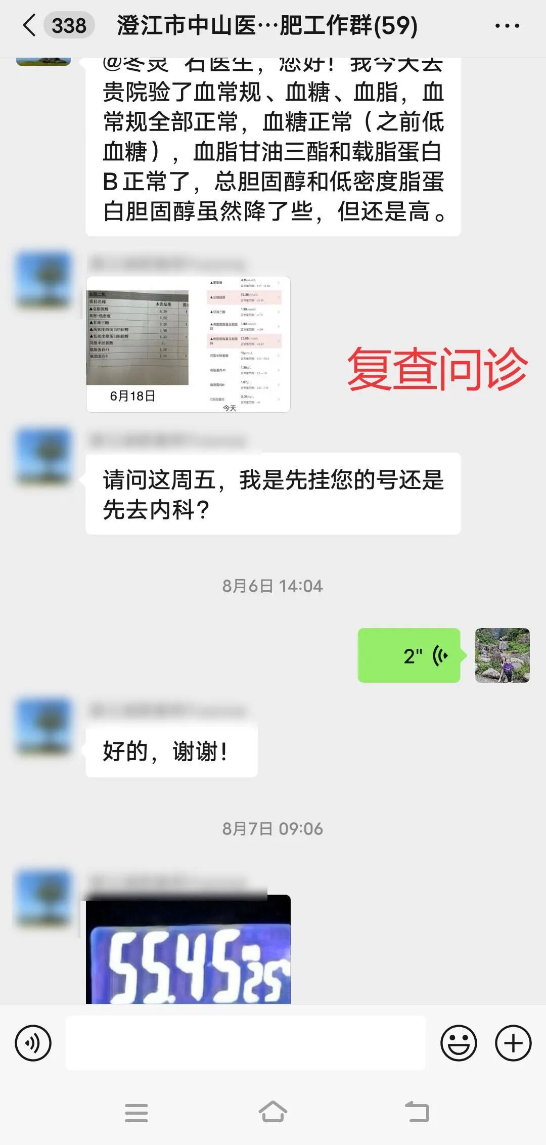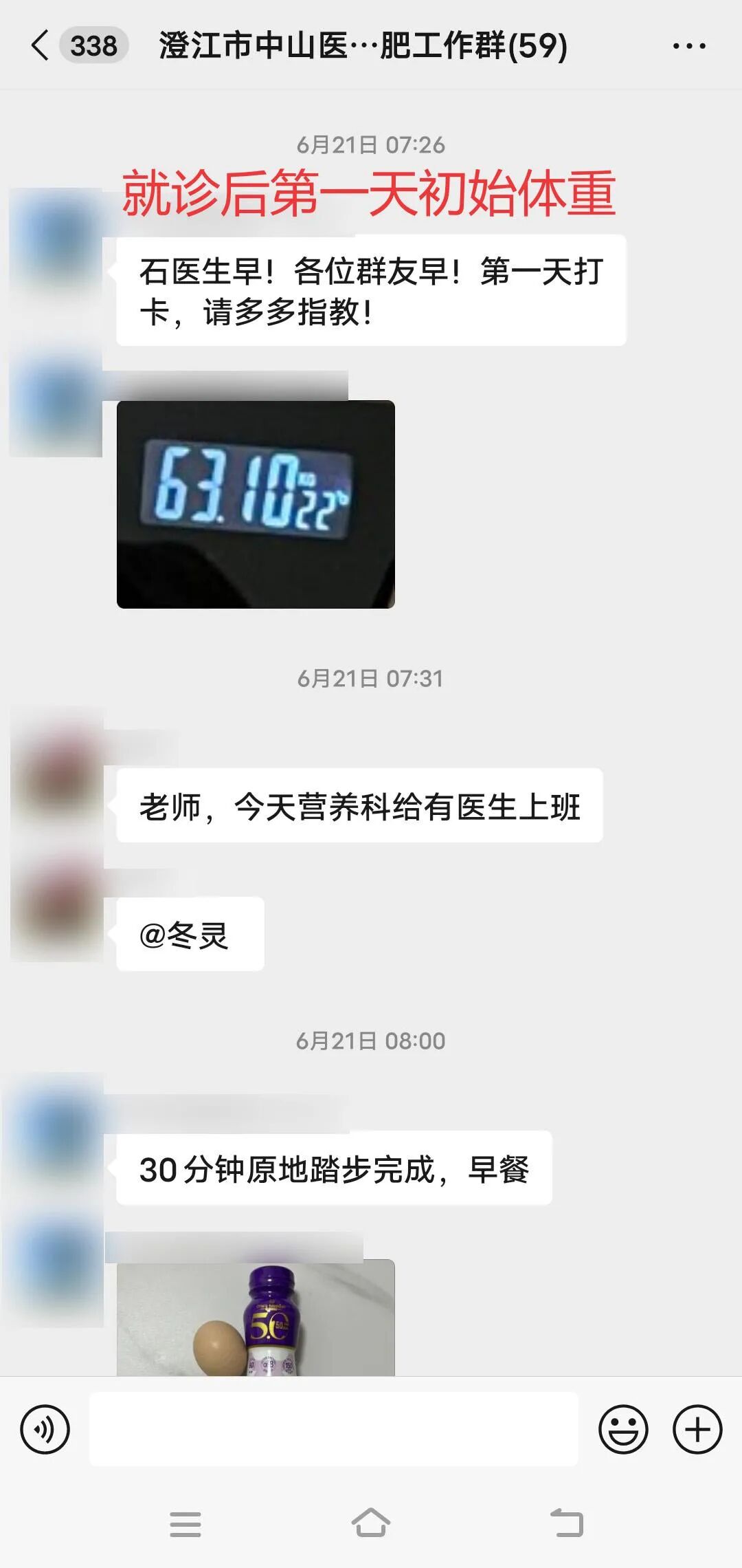 运动计划则注重“碎片化融入生活”。考虑到高女士的日常作息,石红医生建议她每天早上空腹运动40分钟,晚上餐后再散步40分钟,将运动轻松融入生活节奏,避免因高强度运动难以坚持而半途而废。同时,通过微信打卡记录饮食、运动和体重变化,石红医生实时跟踪指导,及时调整方案细节。