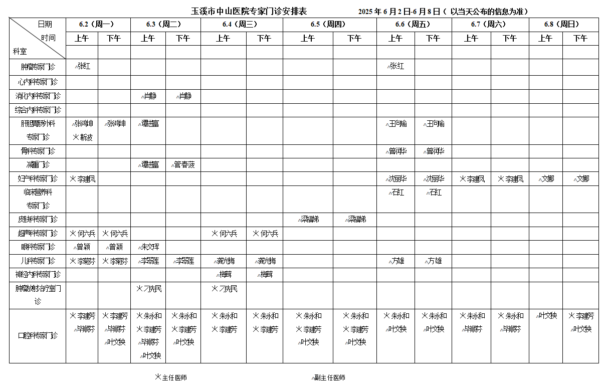 玉溪市中山医院专家门诊出诊表(6月2日至6月8日):