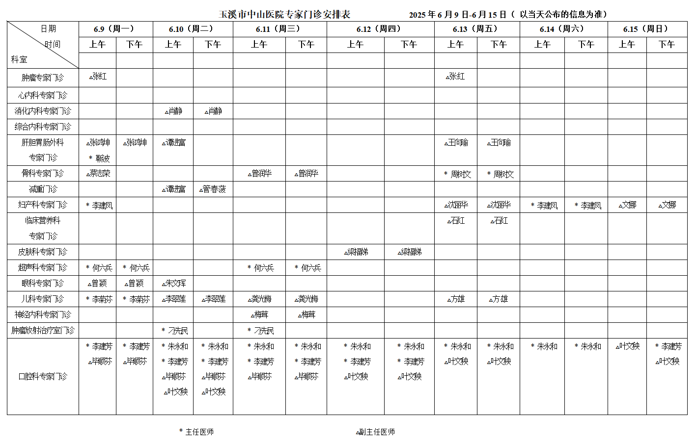 玉溪市中山医院专家门诊出诊表(6月9日至6月15日):