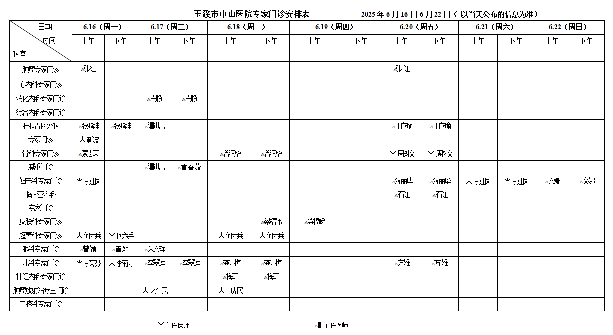 玉溪市中山医院专家门诊出诊表(6月16日至6月22日):