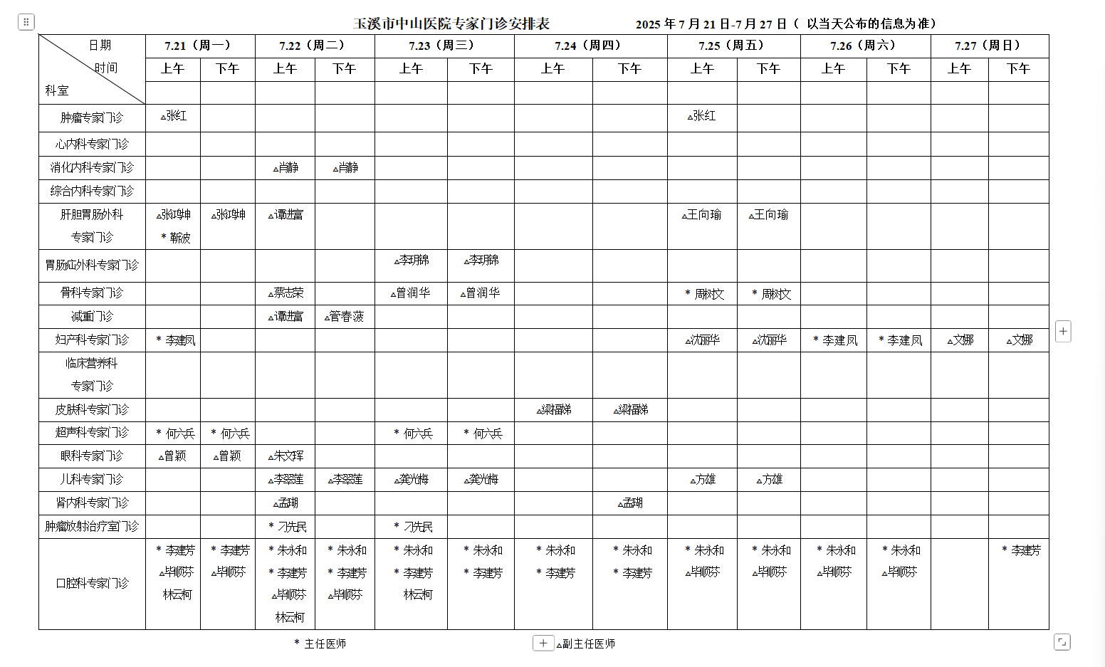 玉溪市中山医院专家门诊出诊表(7月21日至7月27日):
