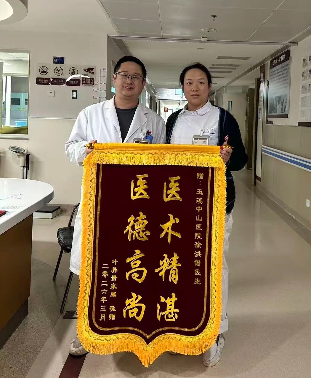 患者还未出院,锦旗已先送到。近日,玉溪市中山医院骨科收到一面“特殊”的锦旗,被医护人员称为“迫不及待”的锦旗。在玉溪市中山医院骨科办公室,前来送锦旗的游先生家属激动地向科室医生表达感谢,并将绣着“医术界的扛把子,病人心中的定心丸”的锦旗交到医生手中。据了解,从重庆来澄江旅居的游先生,于2025年12月3日上午10时左右在家中不慎摔倒,导致右踝三处骨折,被紧急送往玉溪市中山医院救治。因身在异乡、举目无亲,...