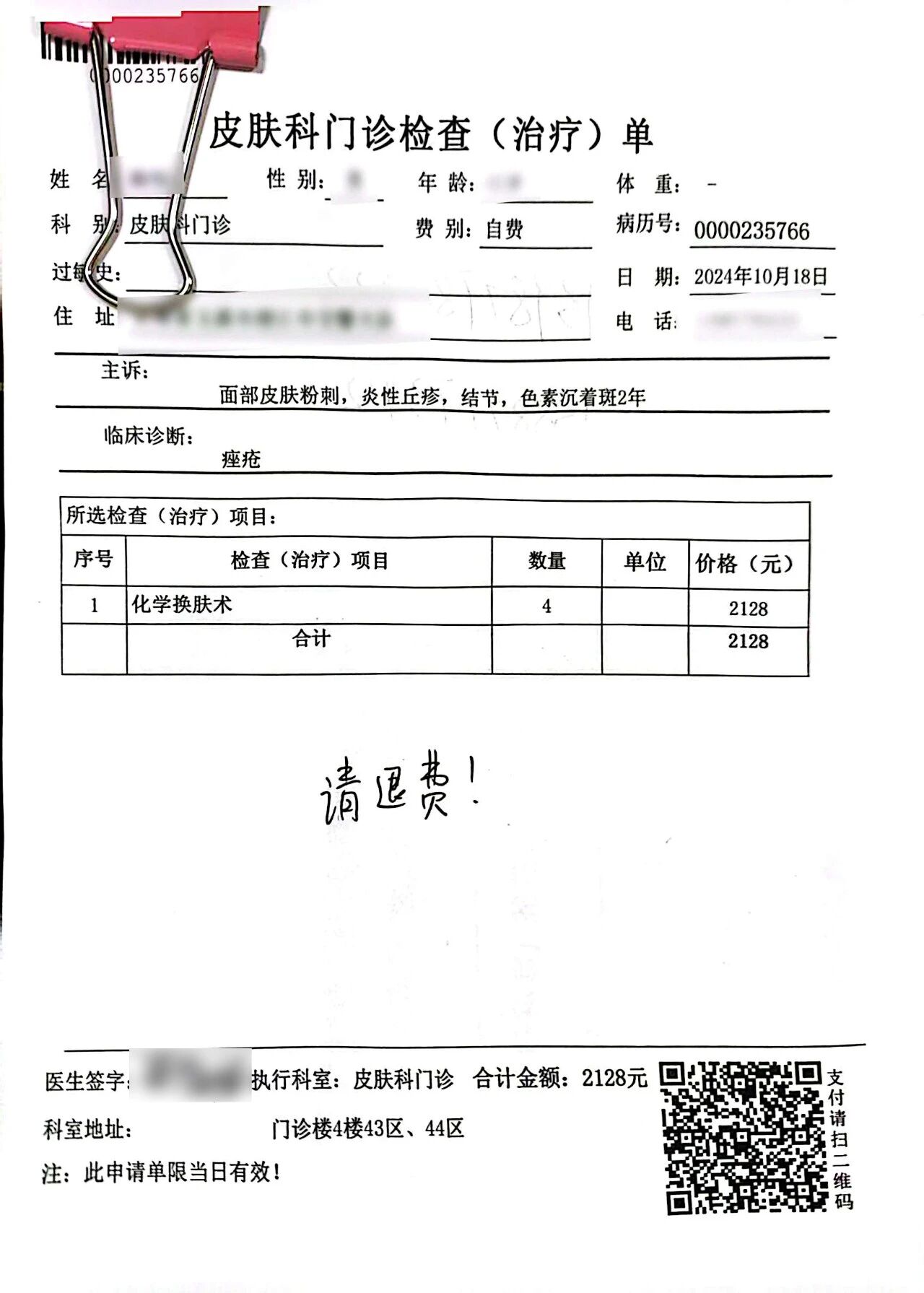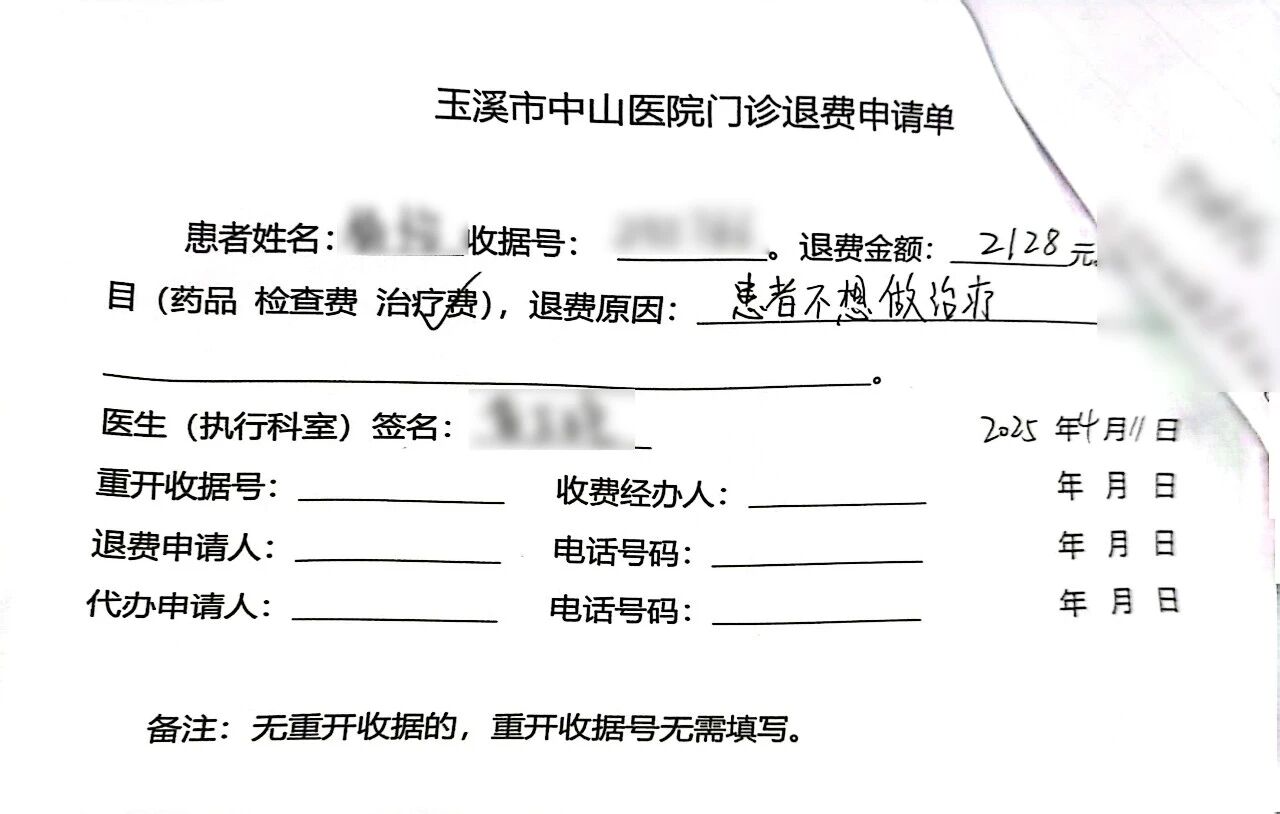 1.申请退费单:患者需前往就诊科室,向接诊医生说明退费原因(如治疗方案调整、无需某项检查/药品等),由医生评估是否符合退费条件。符合条件的,医生将开具并签字确认《退费申请单》。