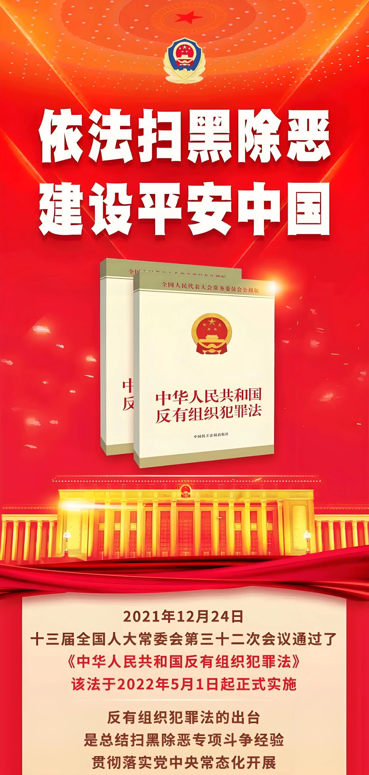 2021年12月24日,十三届全国人大常委会第三十二次会议通过了《中华人民共和国反有组织犯罪法》,该法于2022年5月1日起实施。