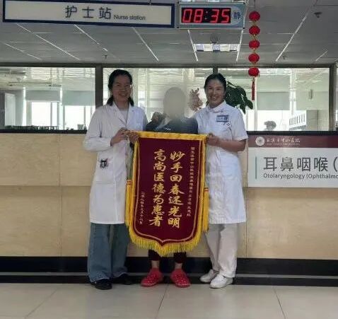 手术由科室副主任李琼波主刀。整个过程顺利平稳,术后第一天占女士左眼视力恢复至0.12,再次复明,随后顺利出院。出院时,占女士协同家人送来一面锦旗以表示她对耳鼻咽喉(眼)科医务人员的感激之情。