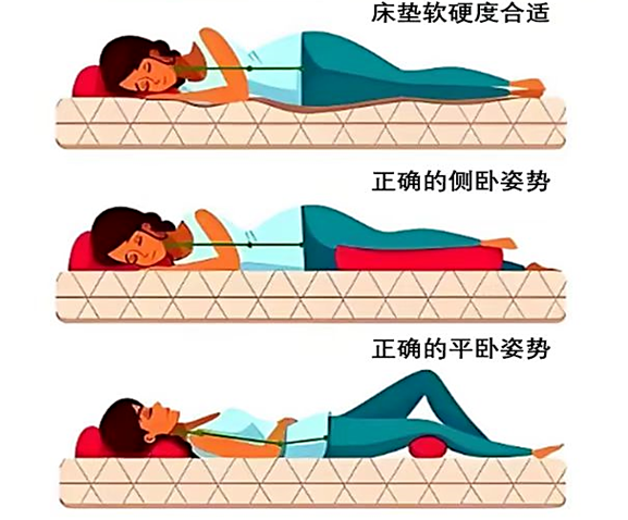 4.睡眠选对床和姿势:建议睡硬板床,能维持脊柱自然生理曲度;侧卧时可以在两腿之间夹一个枕头,让脊柱保持平直。