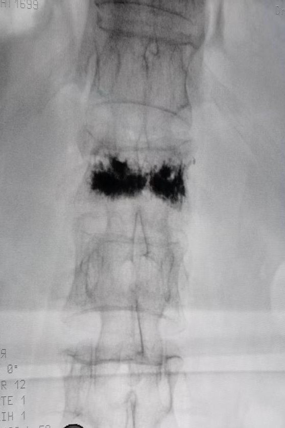第1腰椎骨折术后正位X线片、侧位X线片,椎体黑色部分为手术注入的骨水泥