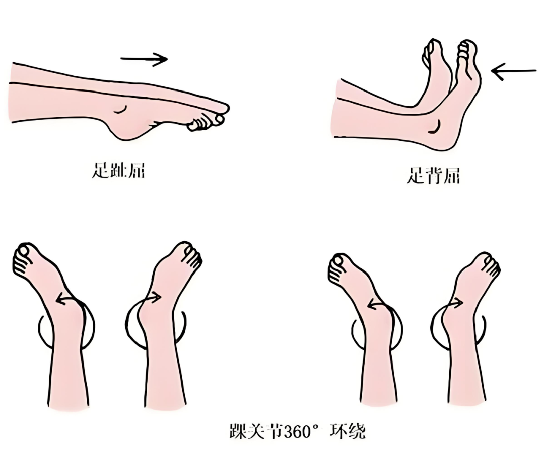 1.24小时内练肌肉收缩:术后24小时内,可在床上做四肢肌肉等长收缩练习,比如踝泵运动(做足趾屈、足背屈、踝关节360°环绕动作)、股四头肌收缩练习,预防深静脉血栓和避免肌肉萎缩。