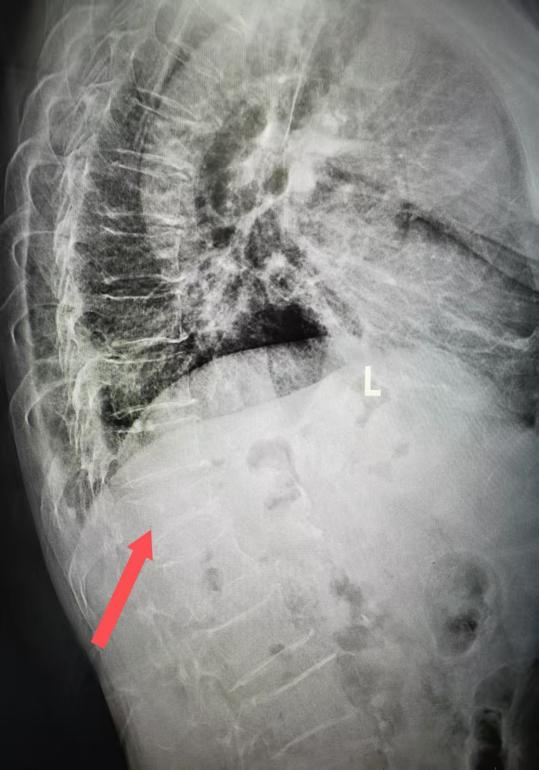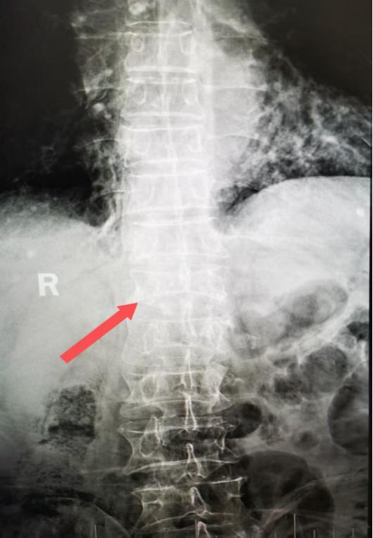 第1椎腰压缩骨折正位x线片、侧位x线片(箭头所示)