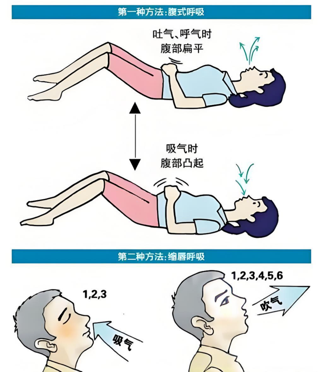 4.呼吸训练防肺部感染:尤其是老年患者,要多做深呼吸练习,比如腹式呼吸(吸气时腹部凸起,呼气时腹部扁平)、缩唇呼吸(吸气数3秒,呼气数6秒),预防肺部感染。