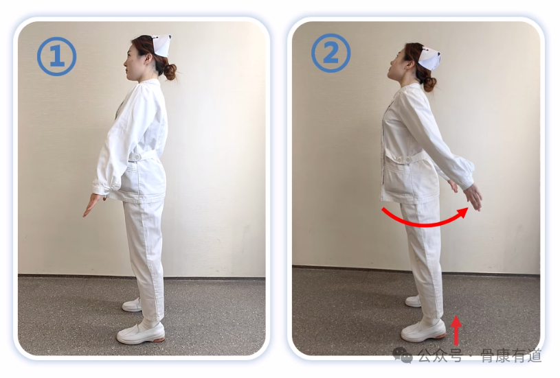 ②踮起脚跟,同时抬头向上看,两臂伸直、掌心向后推出,尽量伸展腰背部,坚持3秒后复原,还原时缓慢呼气。①-②动作为一组,重复10次。注意踮脚抬头伸展时吸气,感受腰背部肌肉紧绷。