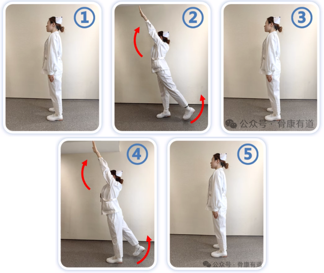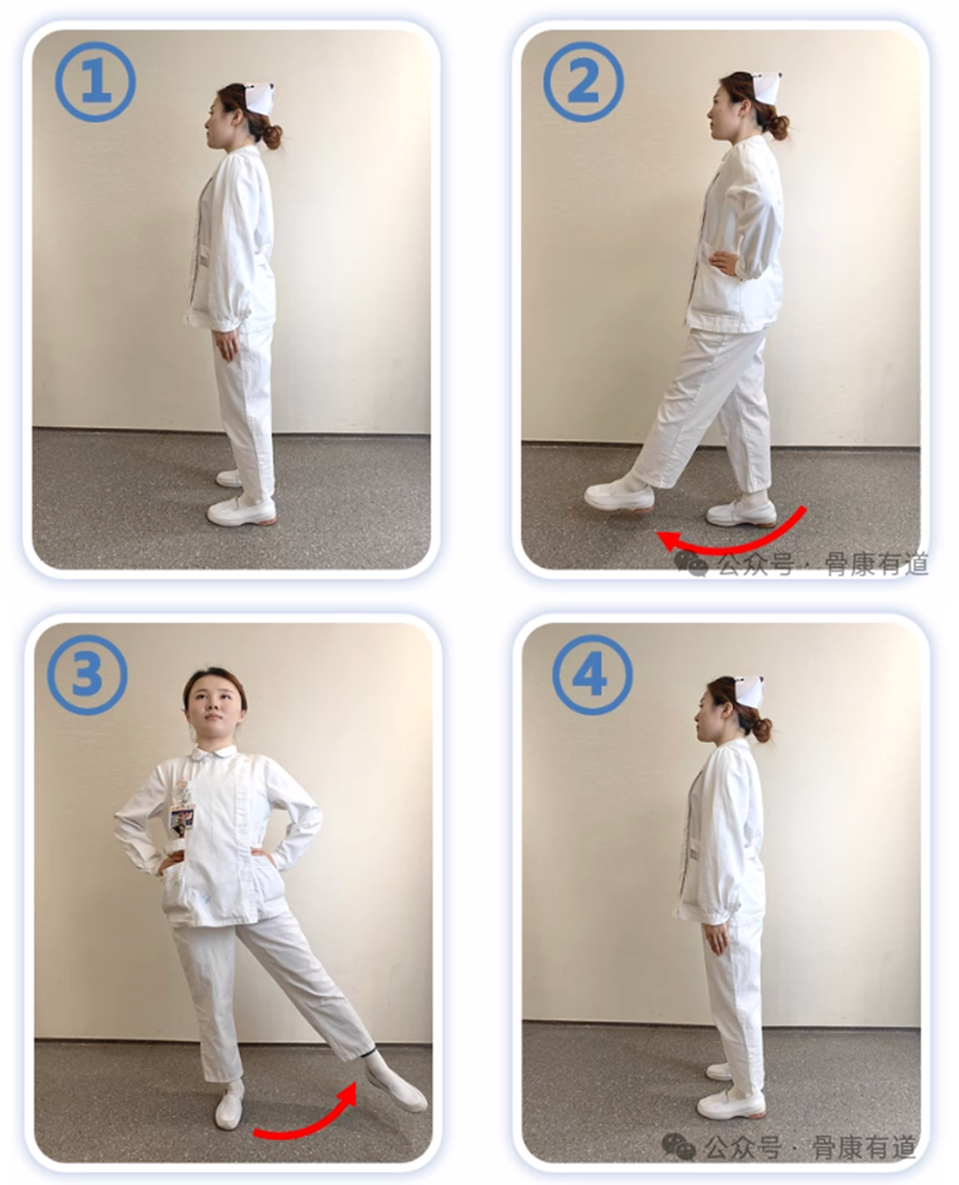 ①-②-③-④动作为一组,左右交替10次。可以单手扶椅背或护栏进行,前抬腿和侧抬腿时膝盖尽量伸直不要弯曲。