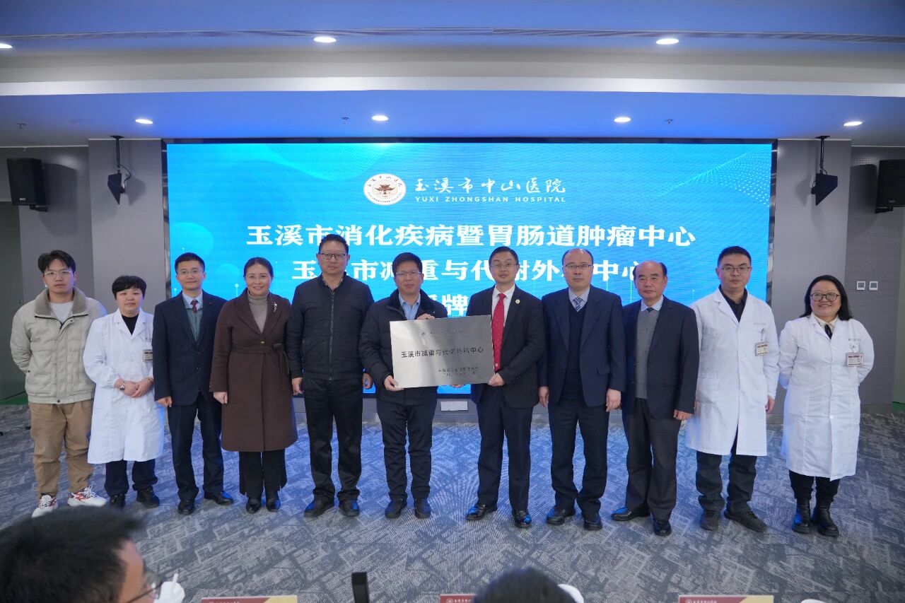 2025年12月3日,“玉溪市消化疾病暨胃肠道肿瘤中心”与“玉溪市减重与代谢外科中心”在玉溪市中山医院举行授牌仪式。此次授牌经玉溪市卫生健康委员会批准,标志着医院在消化系统疾病诊疗、胃肠道肿瘤防治以及减重与代谢外科领域的学科建设迈上崭新台阶,将为区域内群众提供更优质、高效且精准的医疗健康服务。