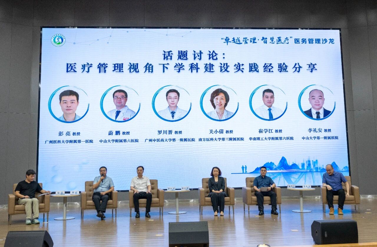 两场专题话题讨论将沙龙氛围推向高潮,专家们围绕行业痛点坦诚交流,贡献多元视角。在“医疗管理视角下学科建设实践经验分享”环节,中山大学附属第六医院医政处处长蔚鹏,广州中医药大学第一附属医院医务部部长罗川晋,南方医科大学第三附属医院质量管理与评价科主任、医务部主任关小倩,华南理工大学附属第六医院医务部主任崔学江,中山大学附属第一医院医务处科长、互联网医疗办公室主任李礼安,分别从中西医结合学科培育、交叉学科发展、人才梯队建设等角度,介绍了各院在学科建设中的差异化实践,为与会者提供了多元化的参考样本。