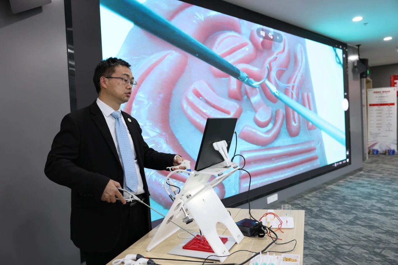 开班仪式后,谭进富院长亲自授课,开展腔镜下外科缝合基础技术培训,通过现场示范、实操指导,向学员讲解了器械选择、夹针技巧、打结方法等核心要点。在随后的实操练习环节,学员分组进行腔镜下夹取、缝合、打结等基础技能训练,讲师团队全程跟踪指导,及时纠正操作误区,现场学习氛围浓厚。
