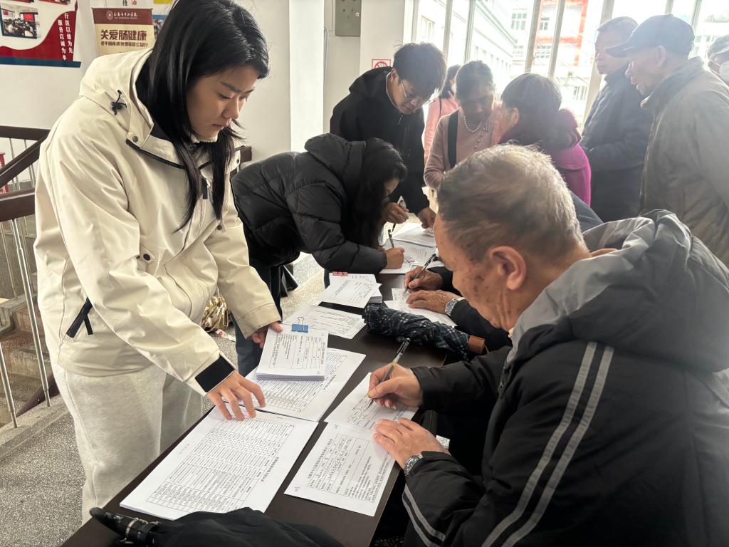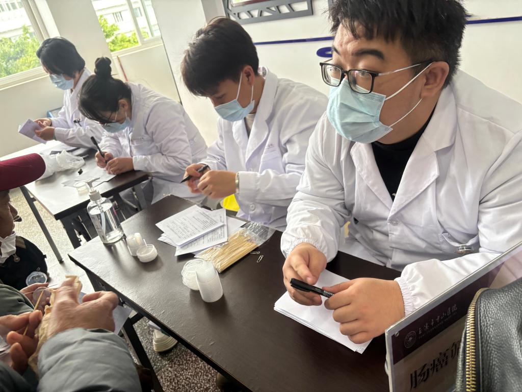 宣讲结束后,公益筛查随即展开。医疗团队现场引导老人有序登记、测量血压、填写信息,同步开展直肠检查,对异常情况当场给予个性化指导。面对“大便带血”“腹胀”等疑问,医护人员耐心解答,将专业服务做到“心坎里”。同时,峨山县人民医院的志愿者们也积极配合筛查,手举指示牌指路,用贴心协助让整个筛查流程更顺畅。
