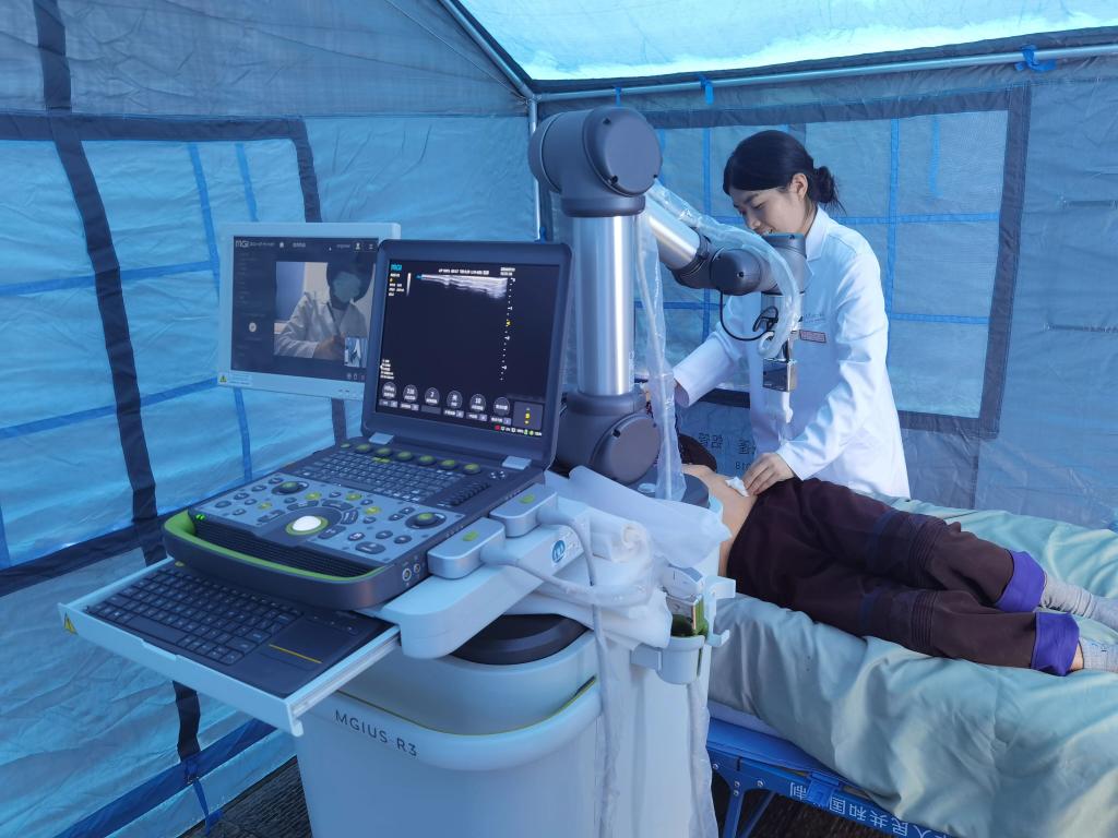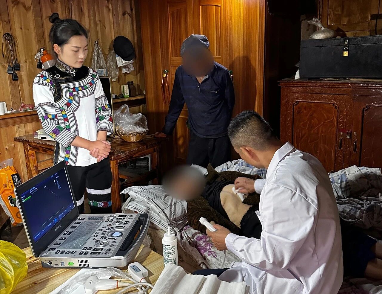 为做好义诊工作,专家队特意携带了移动心电图检查设备、远程移动超声检查设备以及丰富的药品等医疗物资。在中山大学旅游学院学生协助下,医疗队迅速搭建起义诊帐篷,设立多个诊疗台,运用远程超声连线身在广州中山大学附属第一医院超声科主治医师龙海怡通过远程操作,为村民开展专业优质的超声检查。