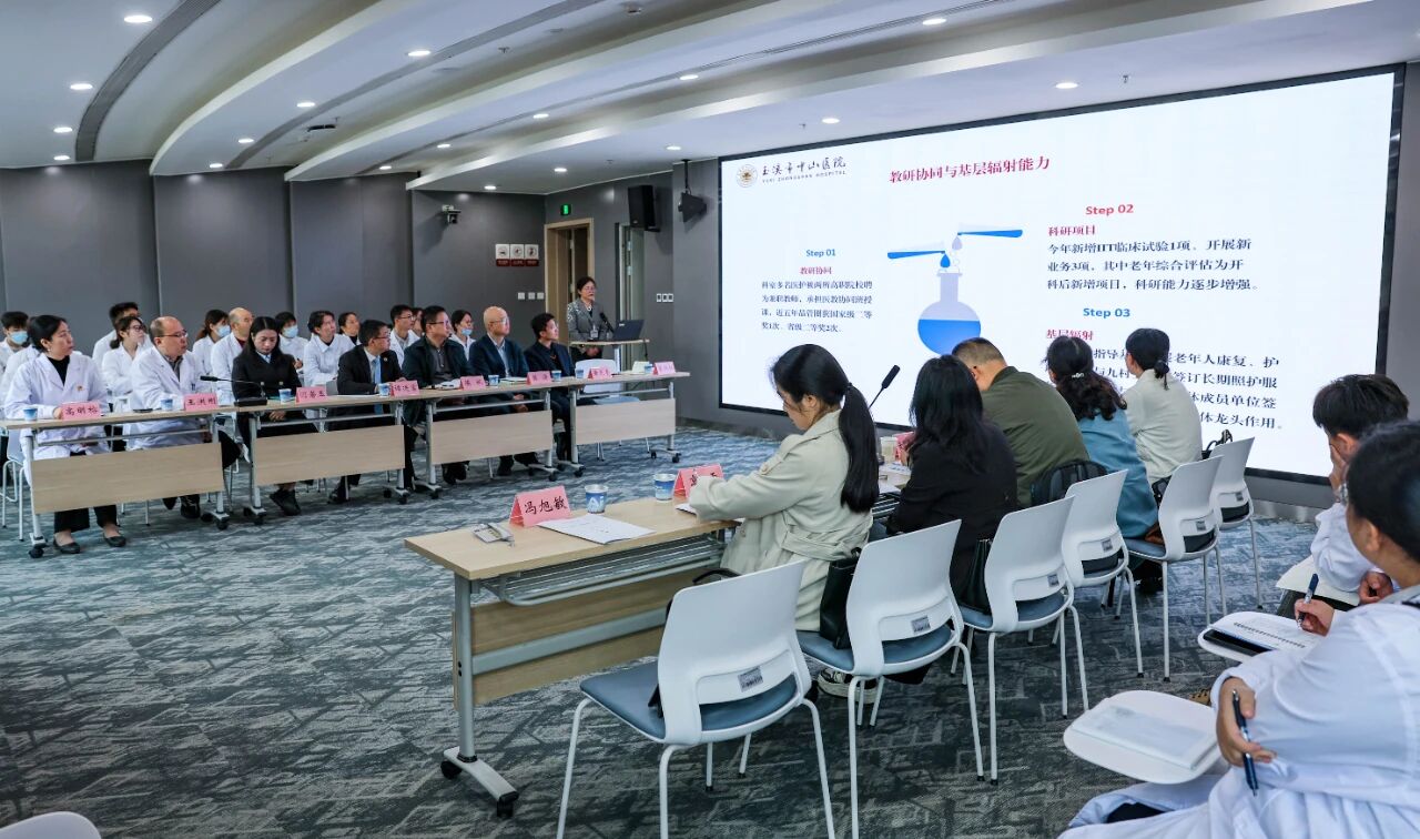 验收汇报会上,老年医学科主任董江仙从适老环境与无障碍设施建设、急救及协助治疗支持体系搭建、医护团队配置、多学科协作及社区健康延伸等多个维度,详细汇报科室建设情况,让验收组清晰掌握科室建设框架。