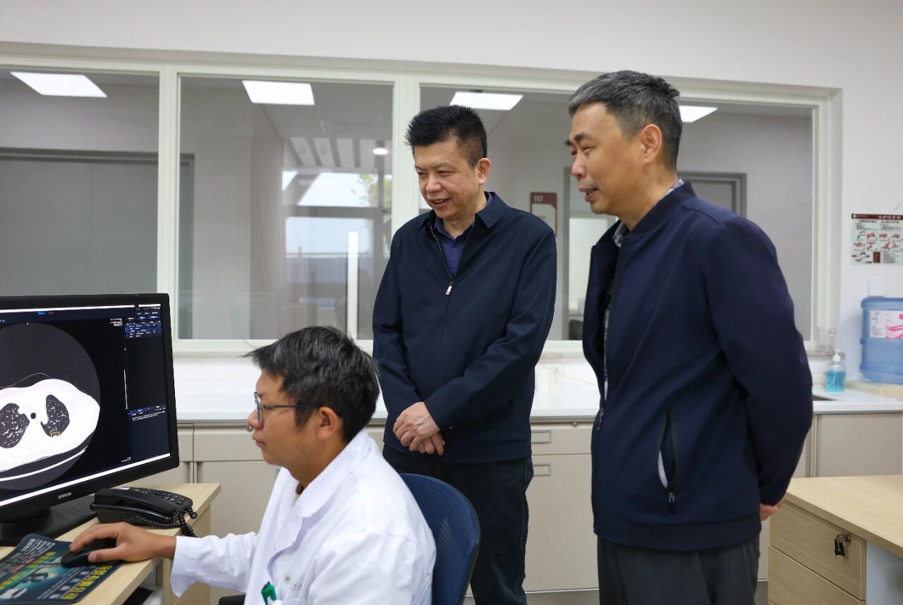 随后,玉溪市人民医院三个科室主任分别前往对应科室开展调研工作,对接沟通具体合作事宜。其中,医学影像部主任马坚在中山一院驻岗专家张朝晖教授的带领下,深入科室了解医学影像科医疗设备的配置情况以及会诊流程等具体工作细节,并对深入合作进行了工作部署。