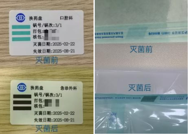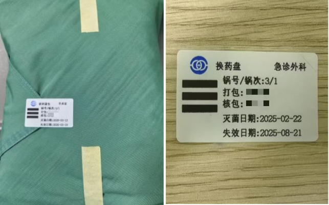 1.查看包外标签信息。物品名称,配包者、包装者、灭菌日期、失效日期,确保物品名称无误,并在有效期内。