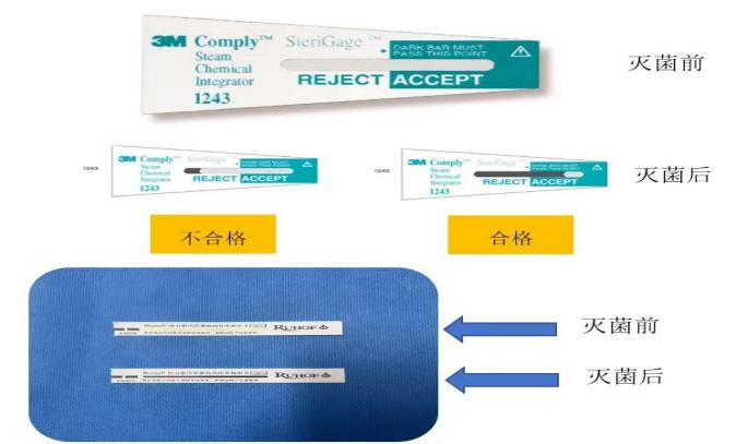 4.打开无菌包后,根据不同灭菌方式及不同包内化学指示物变色情况判断灭菌是否合格。