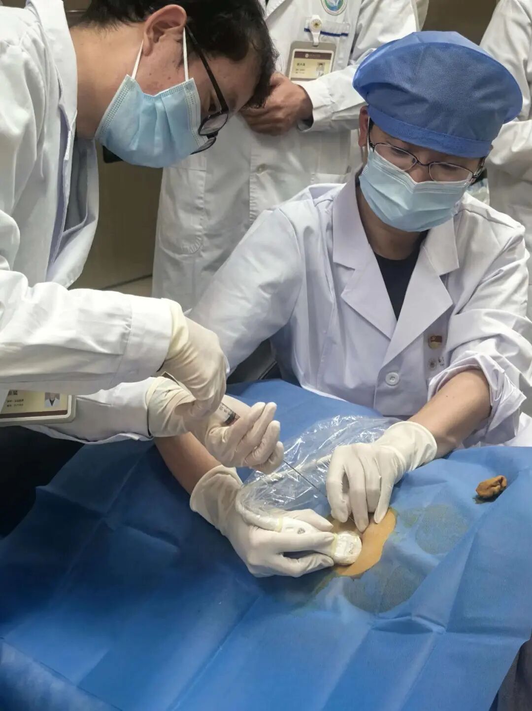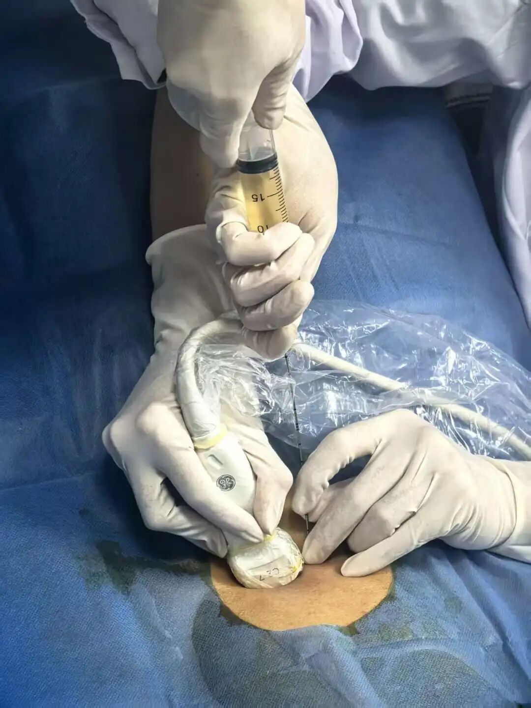 手术在中山一院超声介入科派驻专家黄光亮的全程超声引导下顺利完成。超声引导的全程化与动态化,是此类微创治疗的核心优势,手术过程中,黄光亮教授亲自操作超声设备,他凭借20余年的临床经验和精准的影像研判能力,实时观察解剖结构与进针路径,为手术全程“导航”。在黄光亮教授的实时超声精准定位下,操作医生清晰避开肾脏血管及重要组织结构,将穿刺针准确置入囊腔,彻底引流出囊液后,向囊腔内注入硬化剂。整个过程操作精准、耗时短、出血少,患者耐受良好,术后无需缝合,仅予以加压包扎,术后患者腰部不适症状显著缓解。
